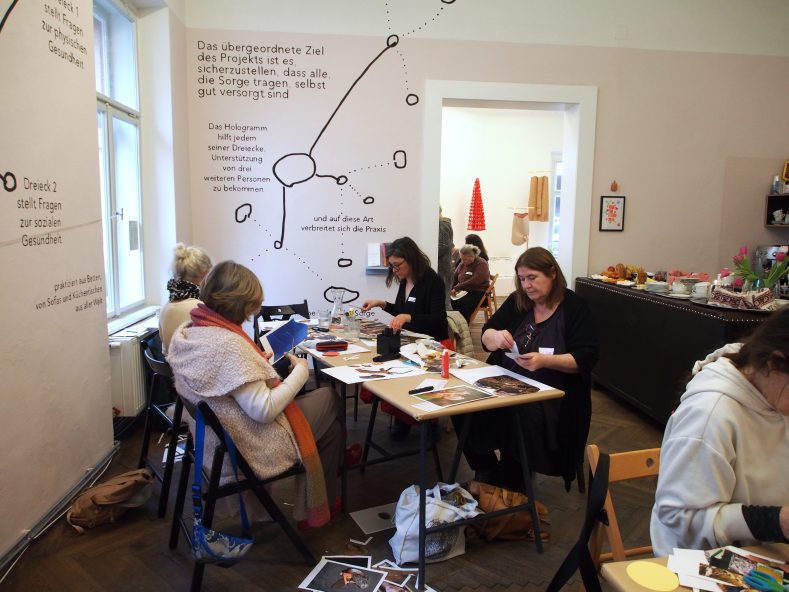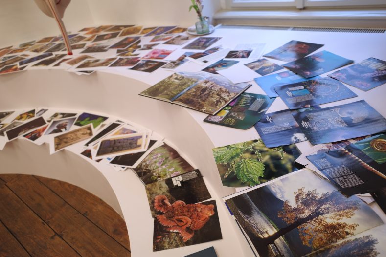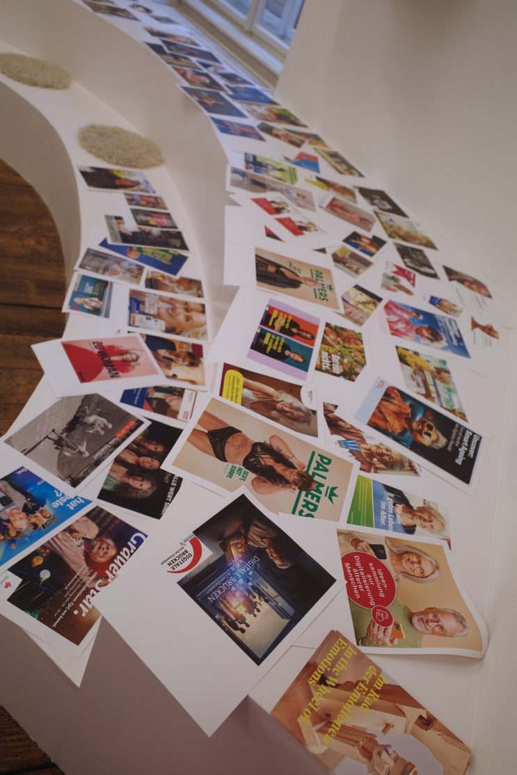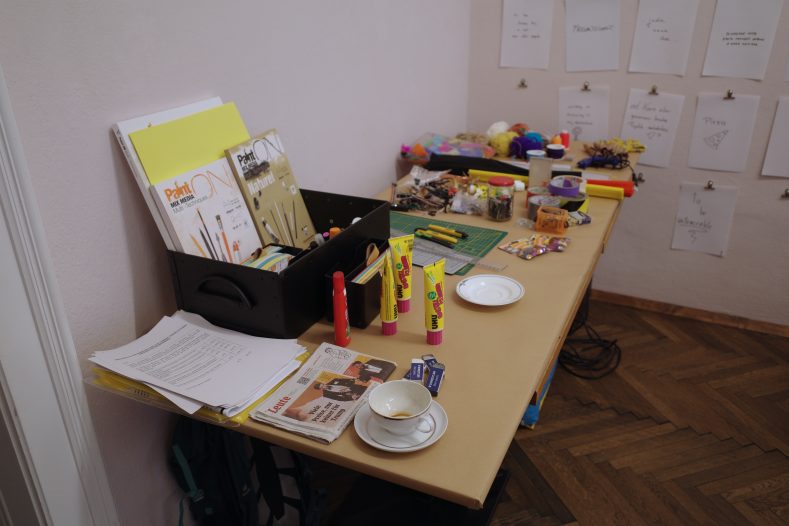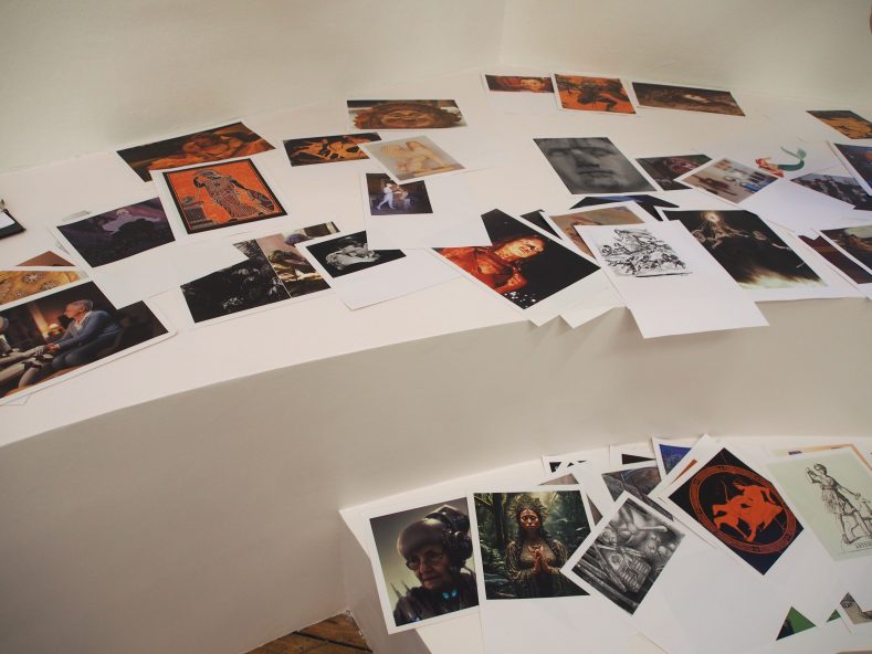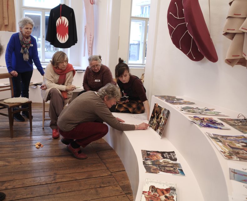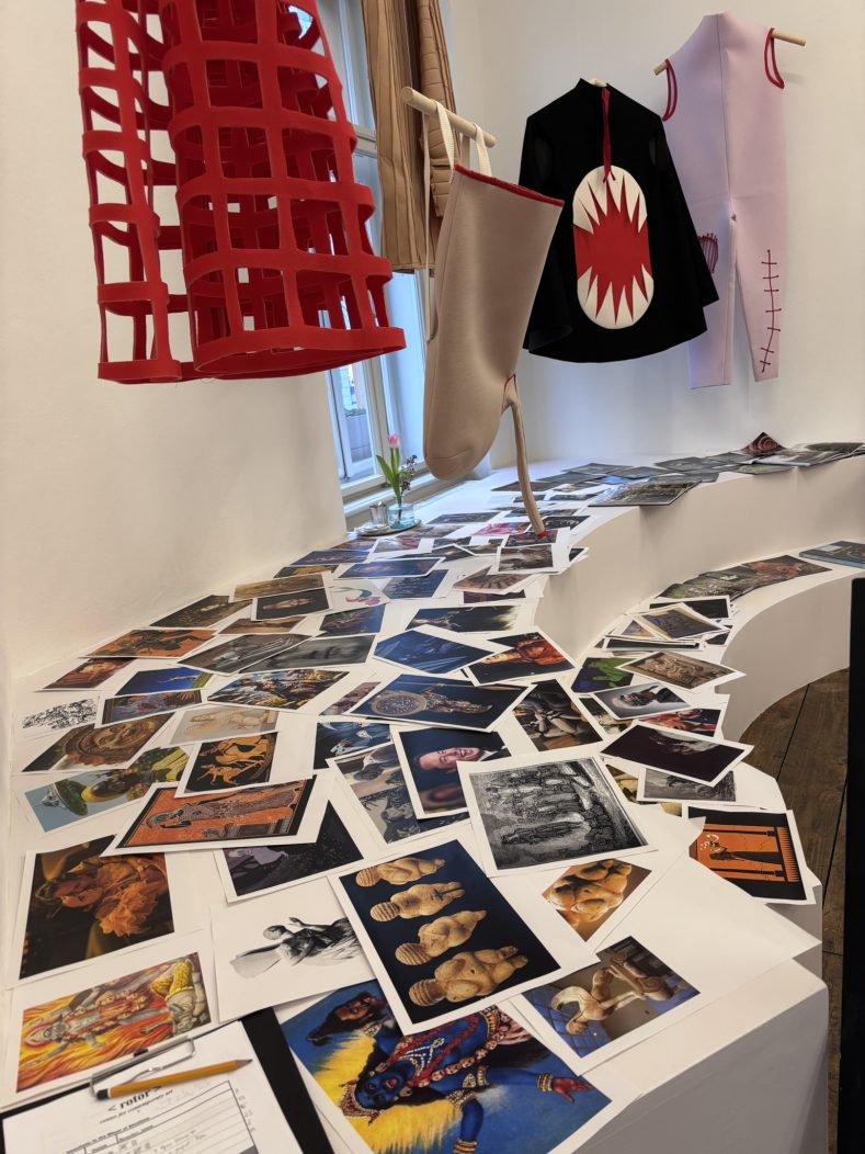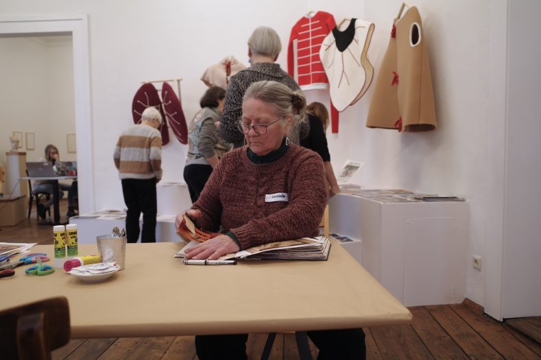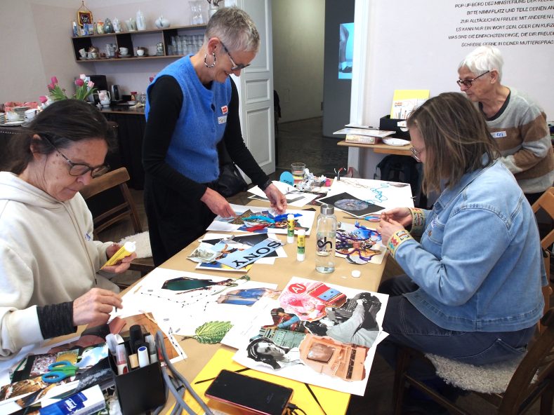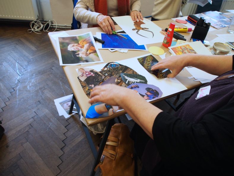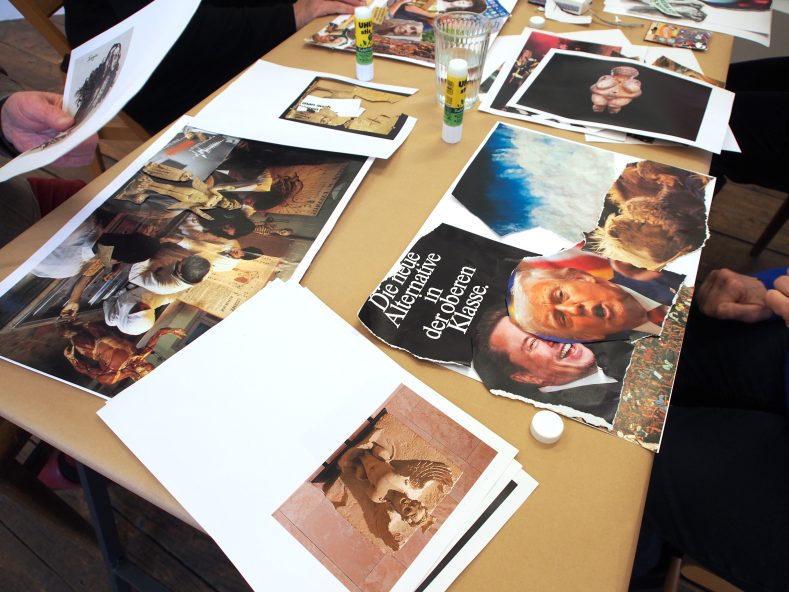 Less than a week later, we met again at < rotor > for our second workshop – monster collages! < rotor > once again provided beautiful catering, this time with turkish bread, olives, peppers, cheese, spreads and fruit, as well as tea and coffee. We arranged the tables differently to make it easier for everyone to move around and gather in smaller groups for the collage activity. A substantial part of the set-up time was taken up with spreading out the huge pile of collage images in the entrance room of the gallery – I might have overdone it with printing images. As the participants arrived, the < rotor > team made sure everyone had a coffee and we gathered around the tables in the meeting room.
