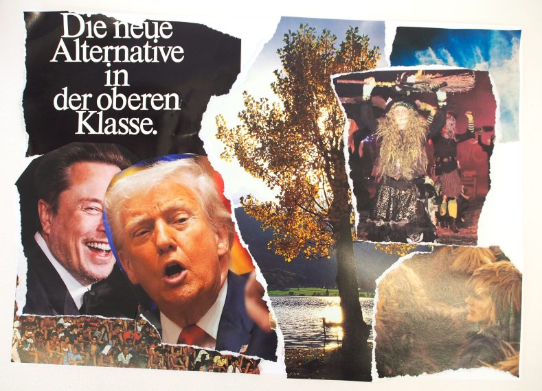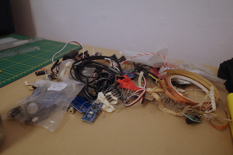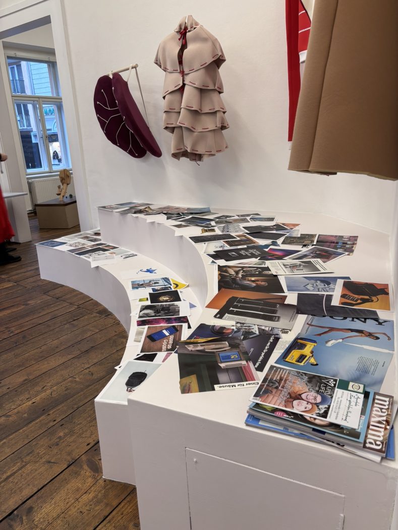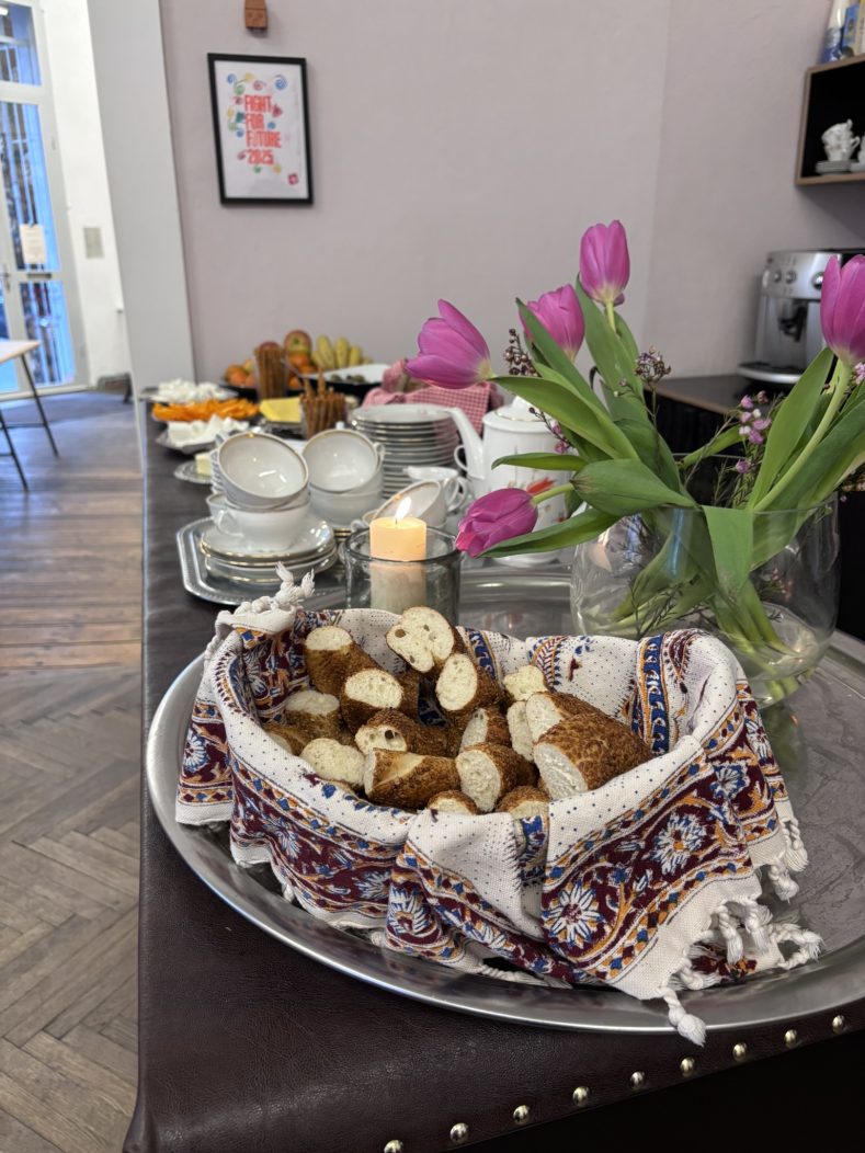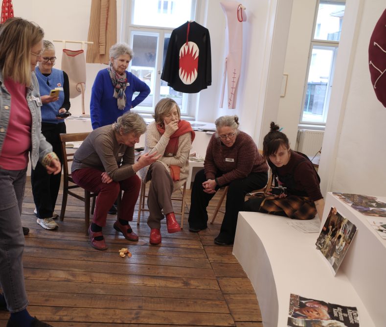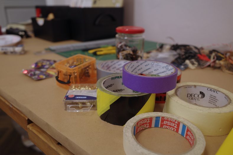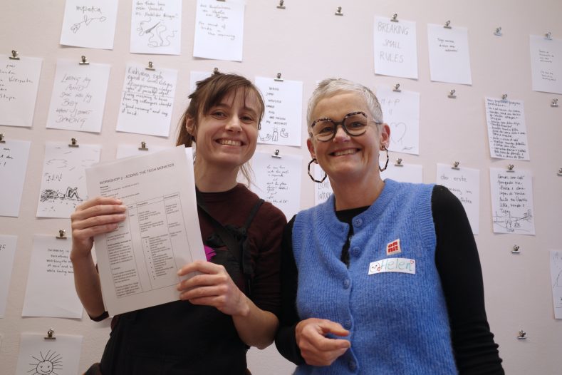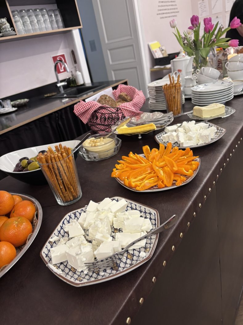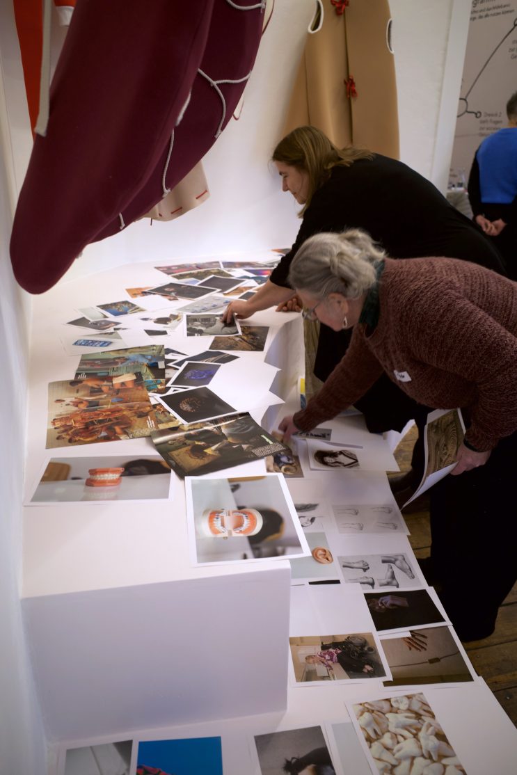 Less than a week later, we met again at < rotor > for our second workshop – monster collages! < rotor > once again provided beautiful catering, this time with turkish bread, olives, peppers, cheese, spreads and fruit, as well as tea and coffee. We arranged the tables differently to make it easier for everyone to move around and gather in smaller groups for the collage activity. A substantial part of the set-up time was taken up with spreading out the huge pile of collage images in the entrance room of the gallery – I might have overdone it with printing images. As the participants arrived, the < rotor > team made sure everyone had a coffee and we gathered around the tables in the meeting room.
