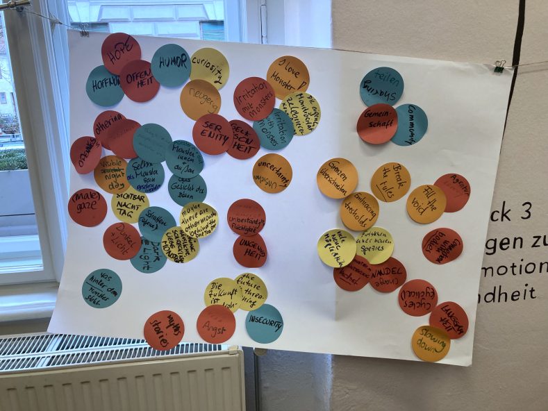 We began the workshop by collecting words and themes in relation to the previous workshop. These were written in both languages on post-it notes and collectively organised into clusters.