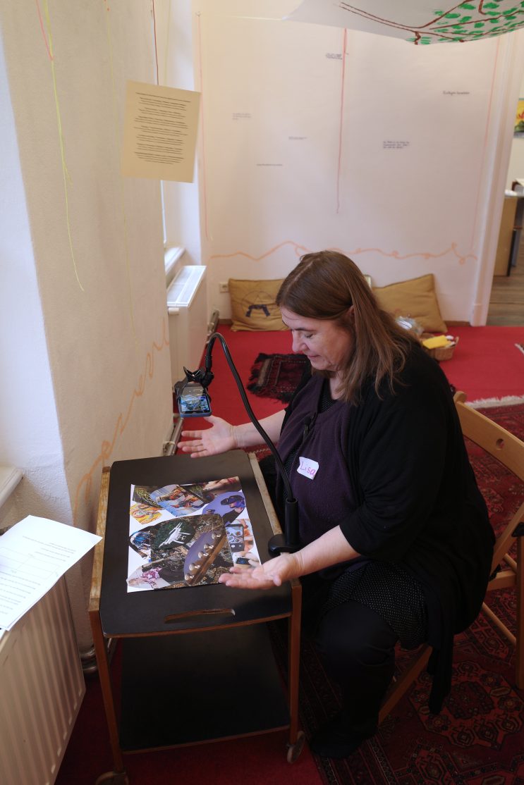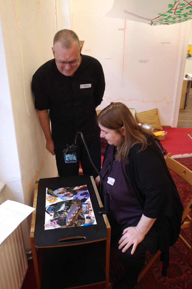 We were surprised by how quiet everyone was as they focussed on making collages –we chatted a little but mostly everyone was absorbed in their work. We ended up joining in and making our own! Once they were finished, the participants took their collages to a private space that Steve had set up where they could film their collages and explain their process.