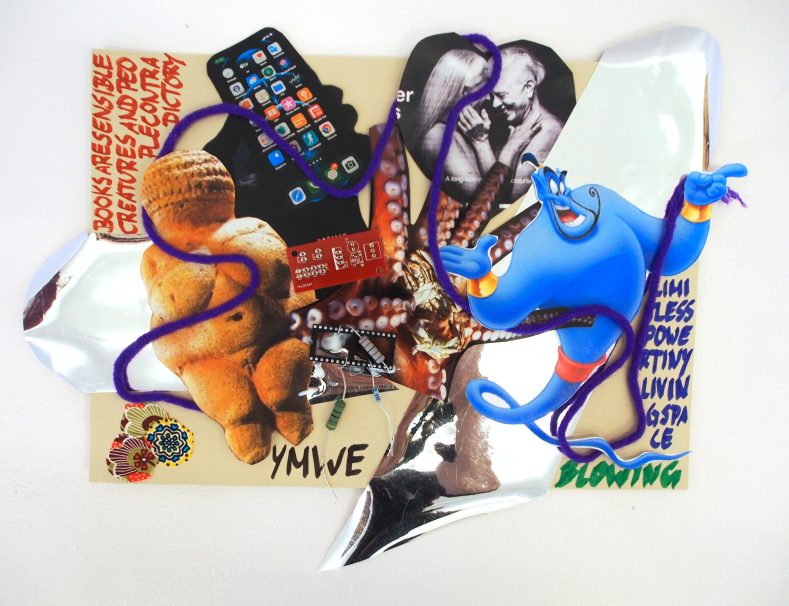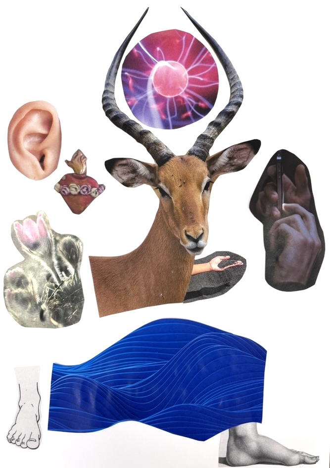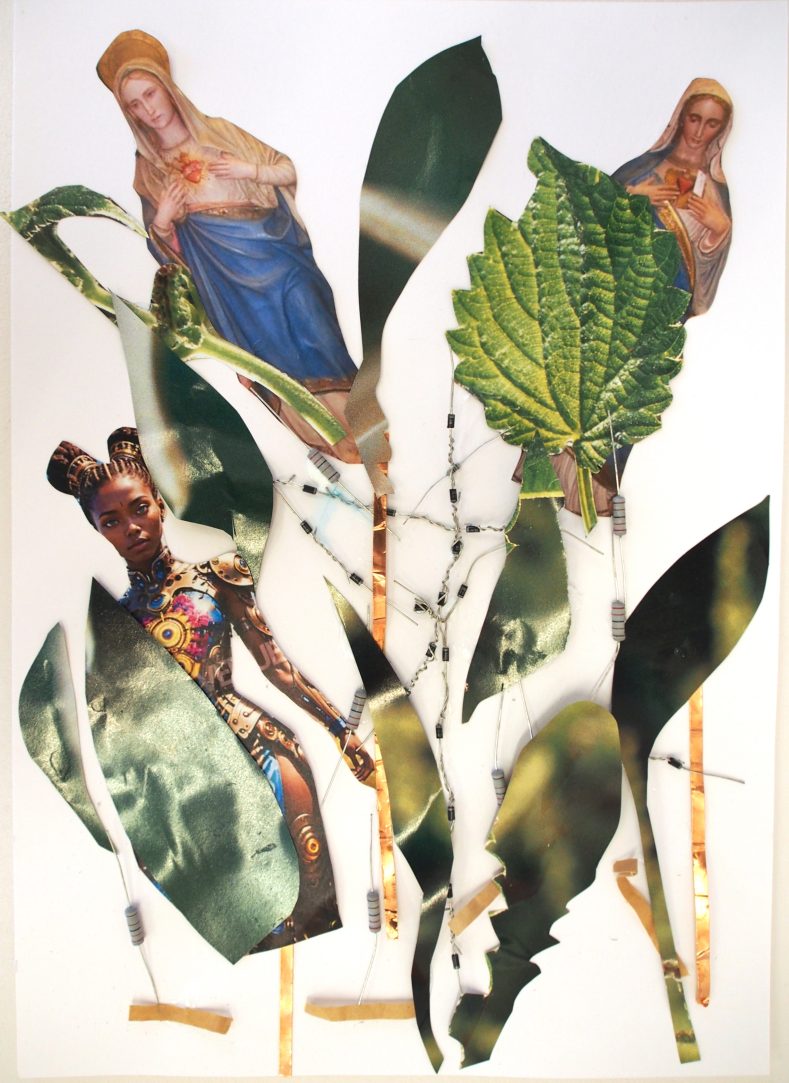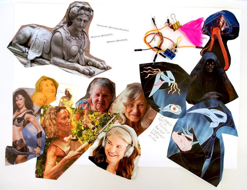 The main activity for this workshop was collage-making. We prepared various craft materials, including some electronic components, and a huge pile of images including the monster images from the previous workshop as well as images of Goddesses, technology, nature and older women.